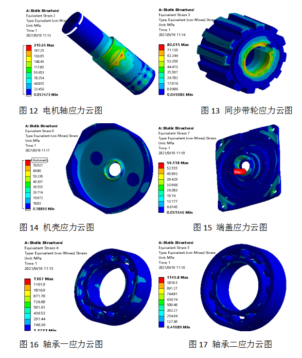 根据表3,结构薄弱点在电机轴上,按照线性假设,放大静态载荷值并迭代计算,当静态力达到XXN后,电机轴中段位置Von-mises等效应力接近轴承用材的屈服强度(如图12所示),此时其它部件最大Von-mises均未达到用材的屈服强度(图13~图17)。因此,若不考虑余量,理论上结构承载极限可到达XXN。