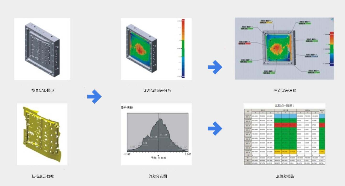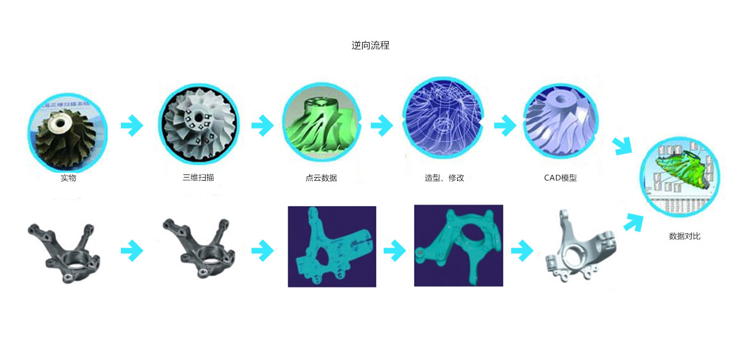 逆向工程,是指针对现有工件,利用3D数字化测量仪准确、快速地取得点云图像,随后经过曲面构建、编辑、修改之后,置入一般的CAD/CAM系统,再由CAD/CAM计算出NC加工路径,最后通过CNC加工设备制作模具。另一种量产方式则是先以快速原型机将样品模型制作出来,然后再以快速模具进行产品量产。
